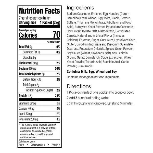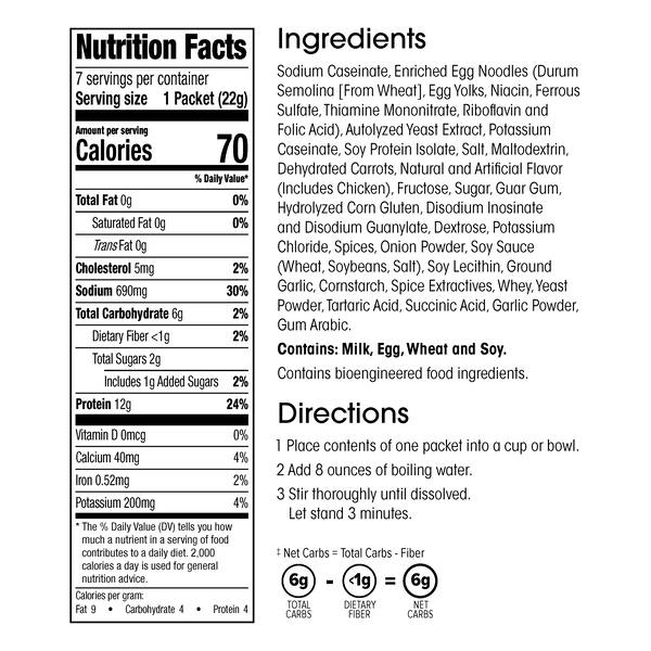 Protein Packed: Every dried packet of protein chicken noodle soup contains 12g protein, 70 calories, 0g fat,and 6g net carbs for a satisfying, light lunch.